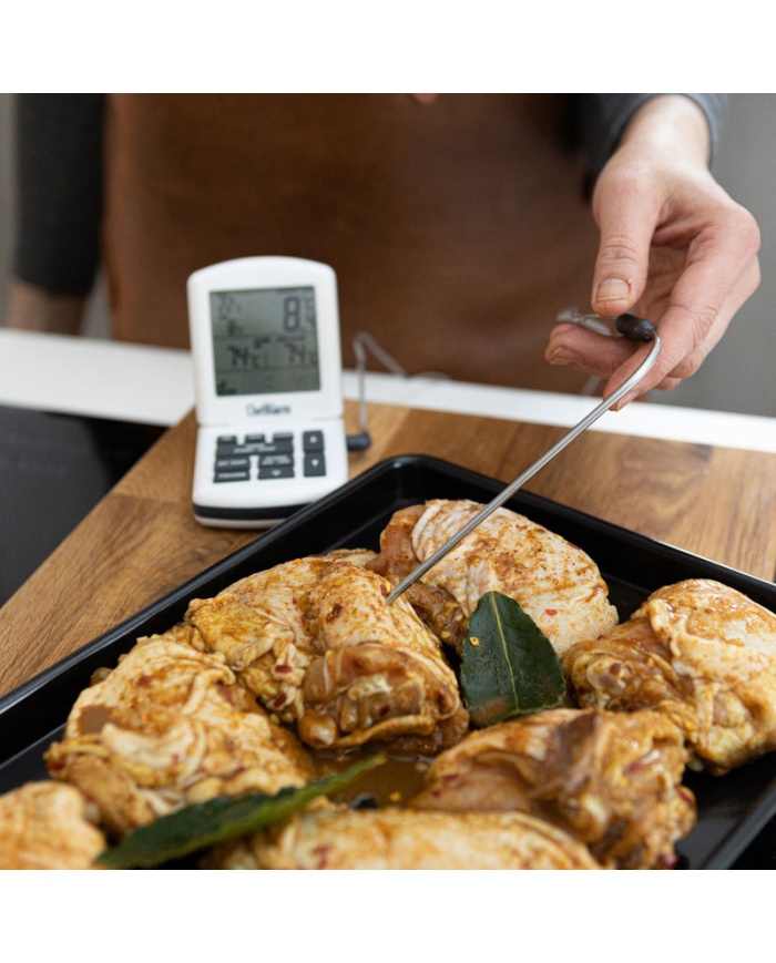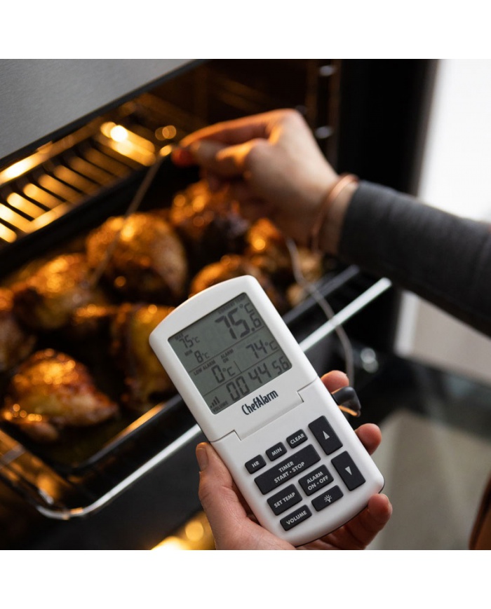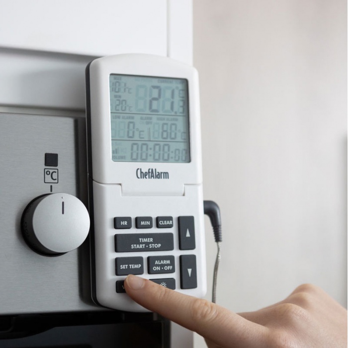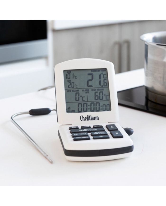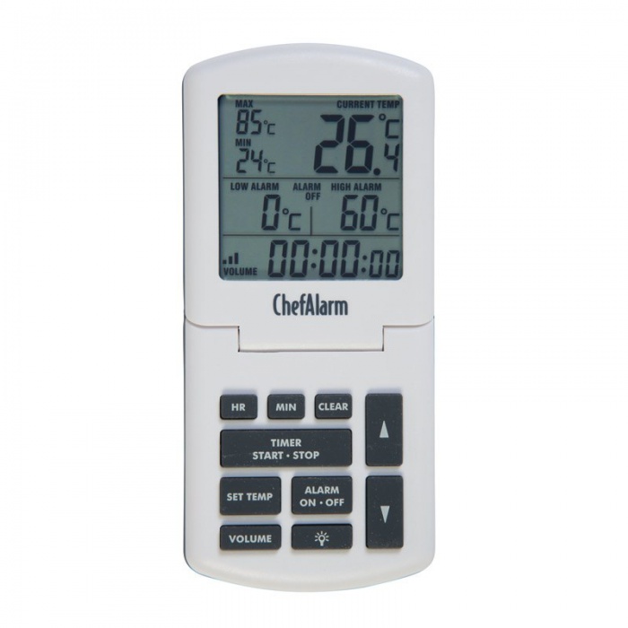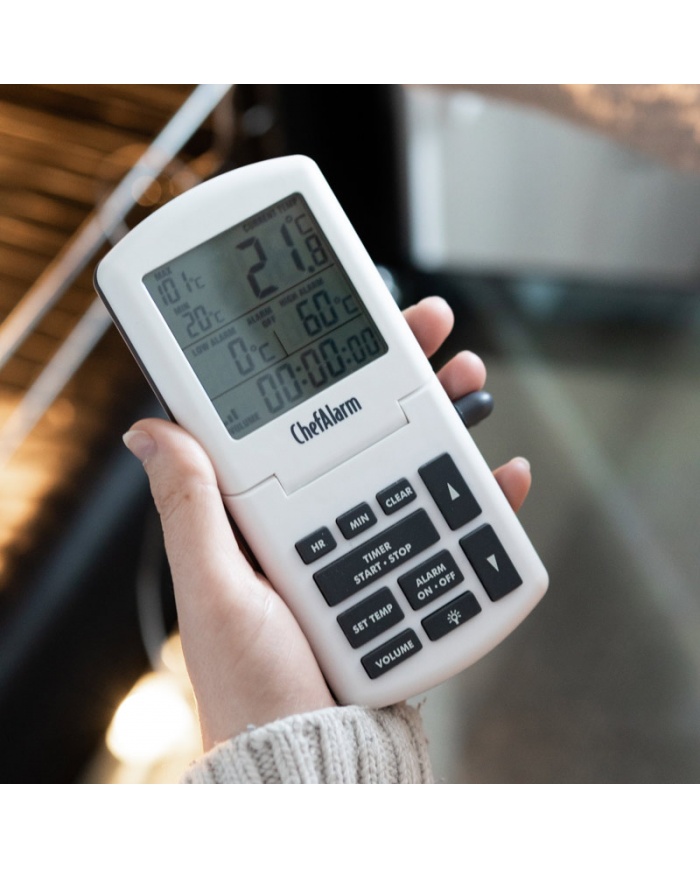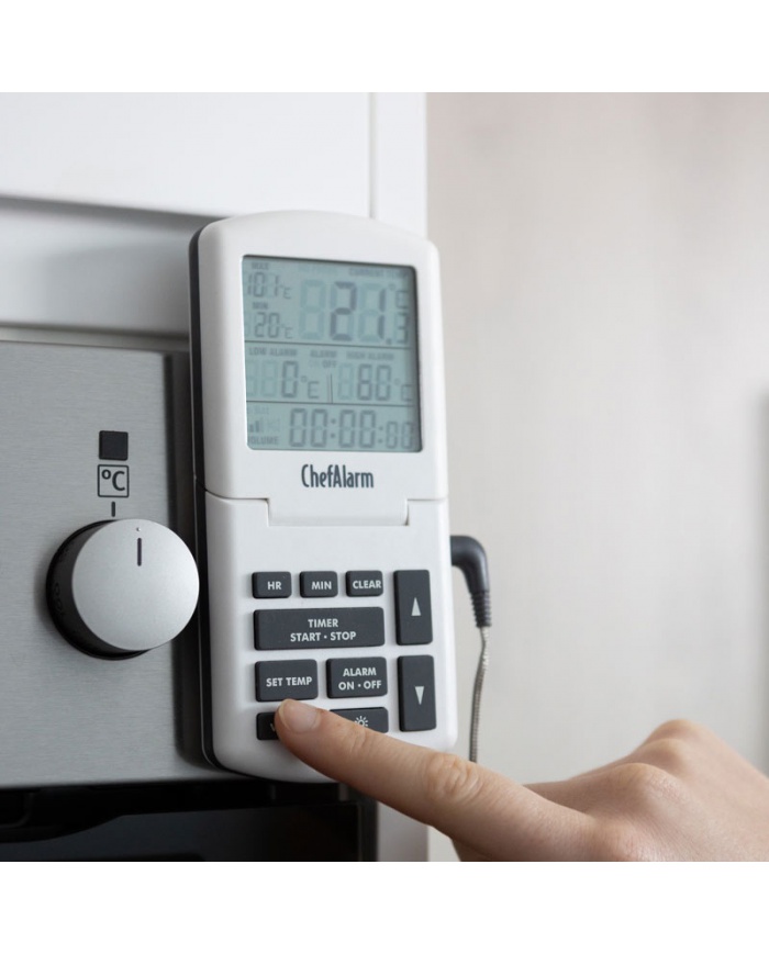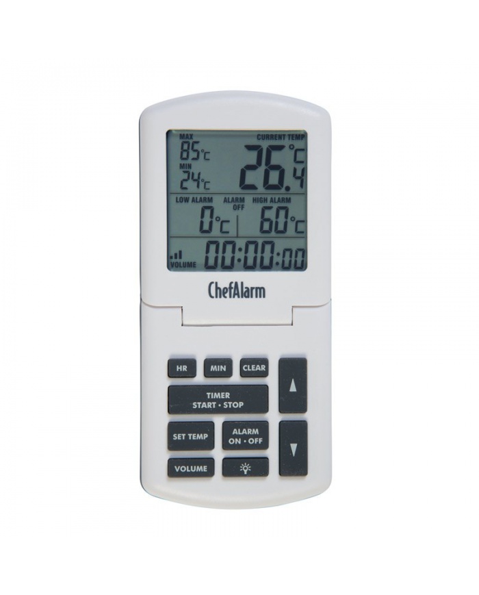 ChefAlarm är en professionell matlagningstermometer och nedräkning/upp-timer som visar nedräkning/upp-tid, aktuell temperatur och samtidigt visar både höga/låga larm och max/min temperaturer.