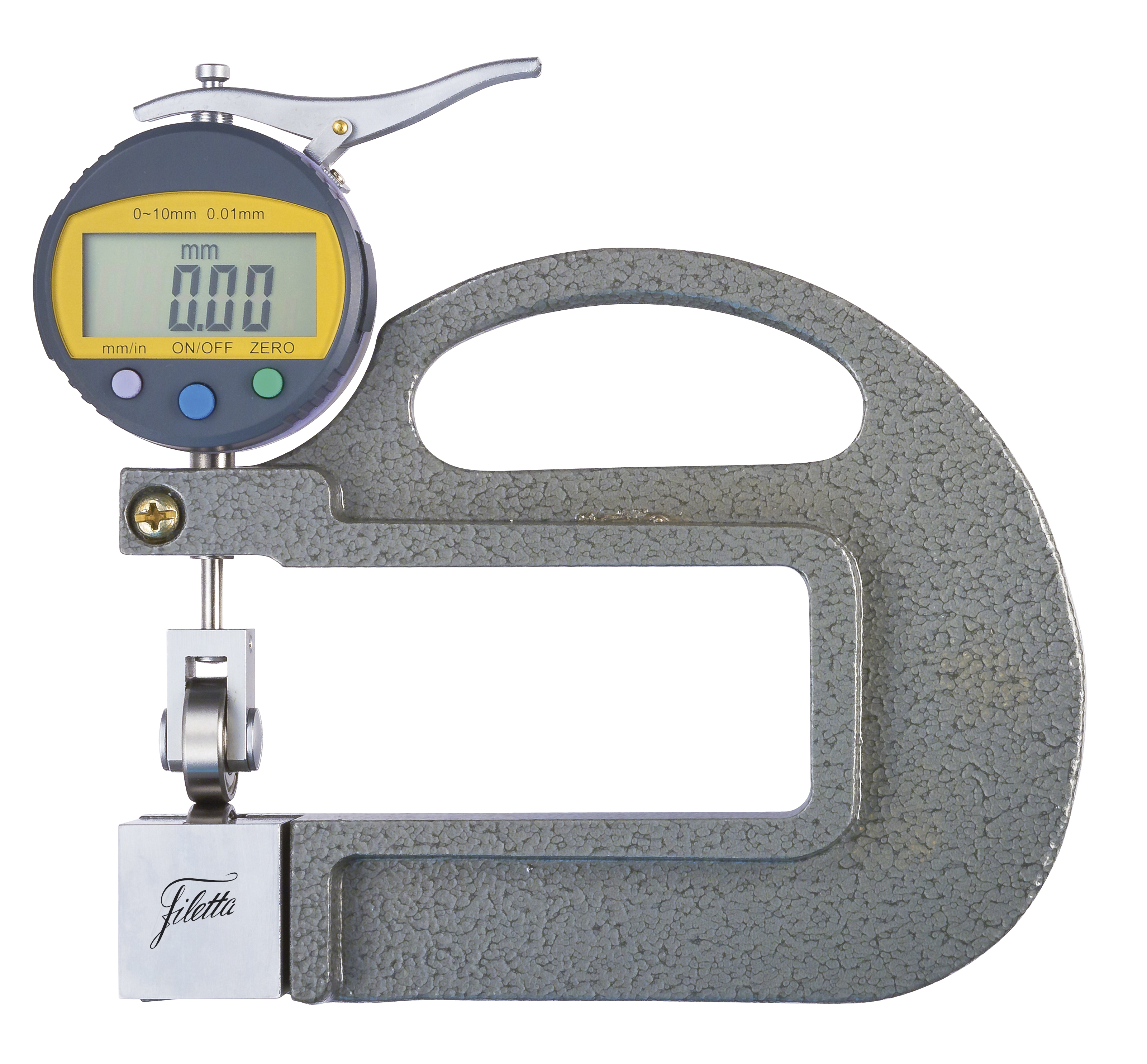 1.380 krDigital tjockleksmätare med rullade mätinsatser, 0-10 mm, upplösning 0,01 mm, mm/tum-omvandling, återställning, halsdjup 100 mm, mätinsatser 7 mm/ø22 mm, städ 28×22 mm