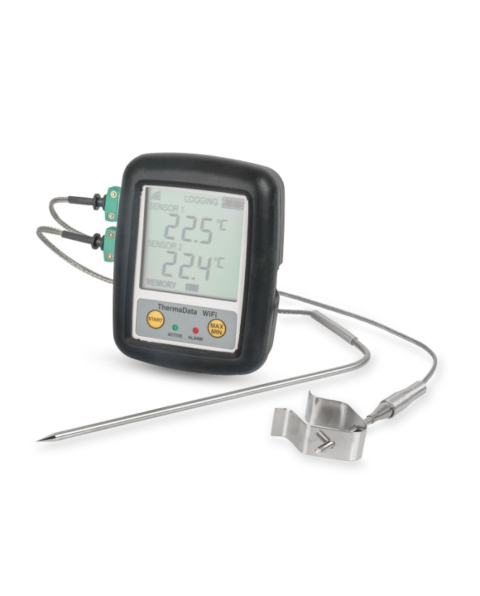 ETI ThermaQ® WiFi Logger-kit för ugnar. Ingår 2st givare, Typ K, för trådlös temperaturmätning med WiFi-överföring av mätdata till molnet och din mobil. Gratis kalibreringscertifikat.