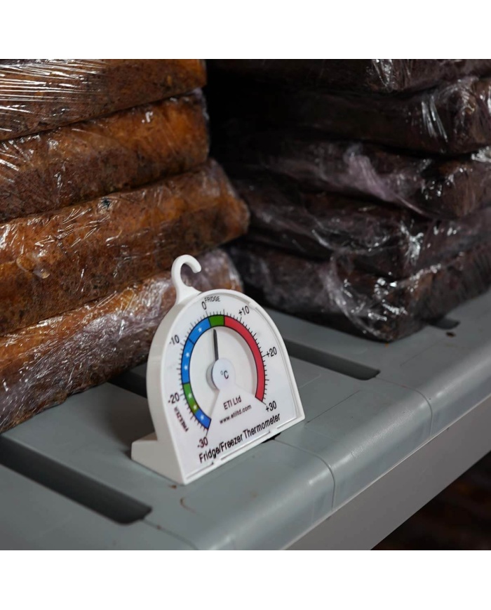 Kyltermometer och frystermometer. Denna kyl- eller frystermometer har en Ø70mm urtavla, vilket indikerar temperatur över ett intervall på -30 till 30°C i 1°C divisioner. Den innehåller tydliga, stjärnmärkta, färgkodade zoner för enkel läsning.