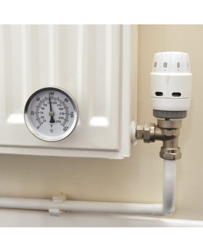 Radiatortermometer eller rörtermometer – Denna Ø60 mm yttermometer i rostfritt stål har en magnetisk avkänningsdyna för montering på järnhaltiga metaller och indikerar temperaturområden 0 till 120 °C eller 32 till 250 °F.