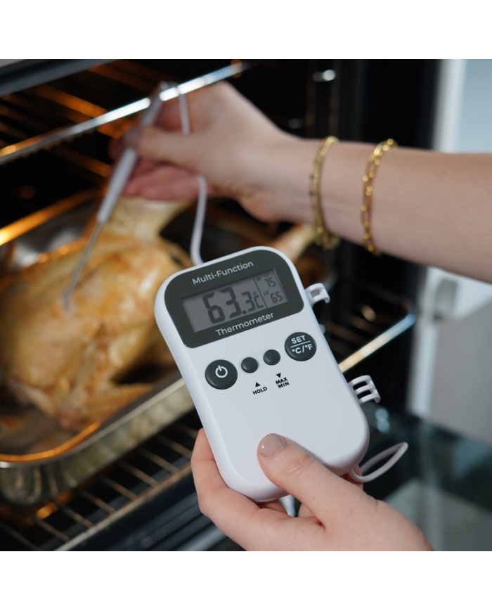 Den digitala multifunktionstermometern är en kompakt och lättanvänd termometer som är idealisk för restauranger, barer och kaféer som en ekonomisk lösning för temperaturmätningstillämpningar. Den har en displayhållare, max/min-minne och en CalCheck 0,0 °C-funktion tillsammans med ett justerbart hörbart hög-/lågtemperaturlarm. Multifunktionstermometerhöljet och sondhandtaget innehåller Biomaster-produktskydd som minskar bakterietillväxten. Varje enhet levereras med en matpenetrationssond i rostfritt stål (Ø3,5 x 125 mm) med en meter PVC-anslutningsledning, fickklämma och sondskydd.