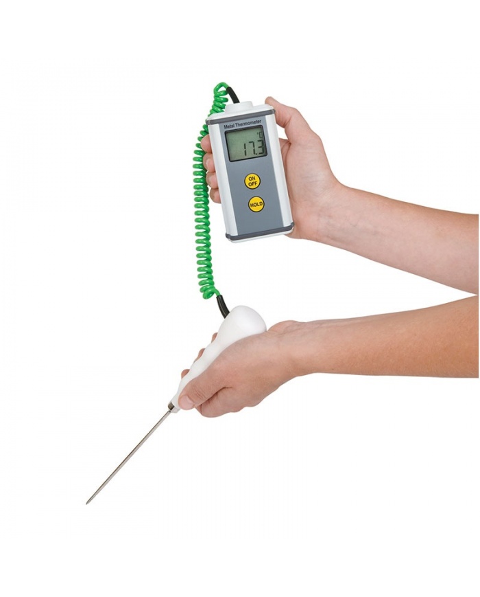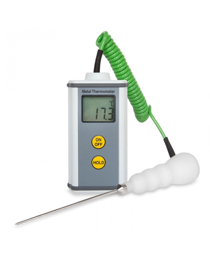 CaterTemp Metal-termometern mäter temperaturen i intervallet -49,9 ºC till 299,9 ºC. Den har en stor, lättläst LCD-skärm. Enheten har också en automatisk avstängningsfunktion som automatiskt stänger av instrumentet efter tio minuter, vilket maximerar batteriets livslängd.