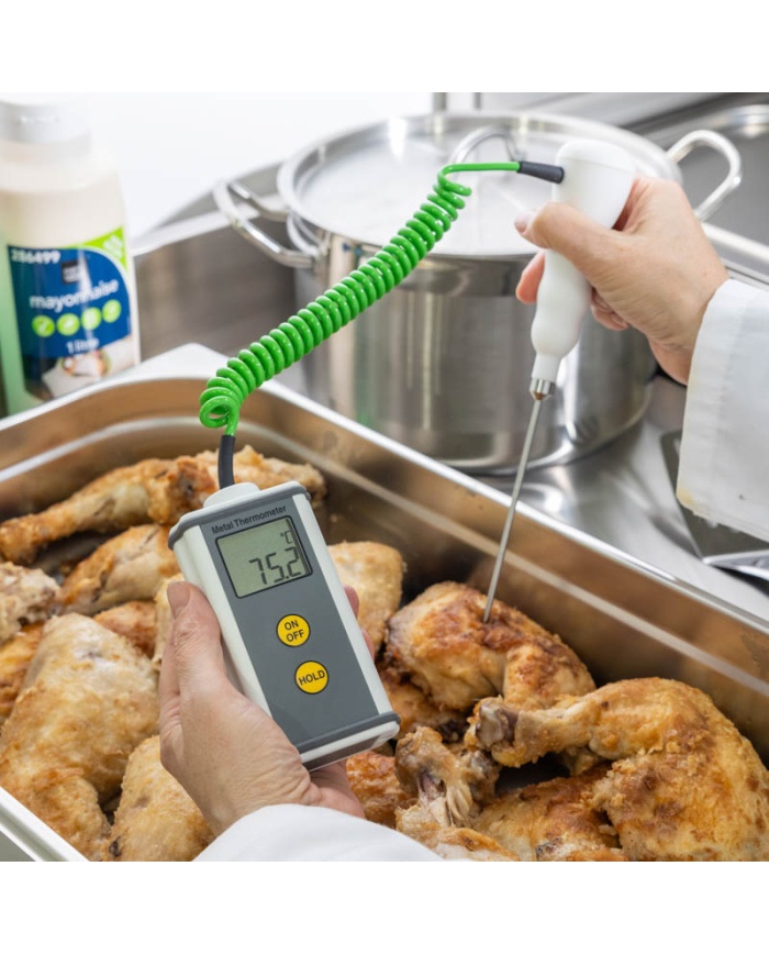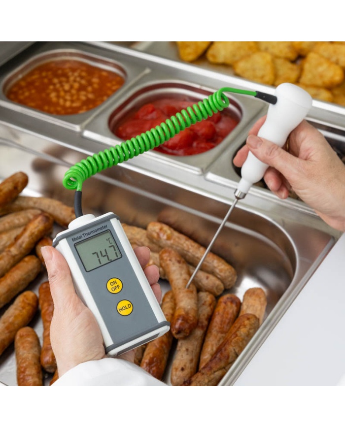 Varje CaterTemp Metal-termometer levereras med en permanent fastsatt, vattenbeständig, kraftig matpenetrationssond med en Ø3,3 x 130 mm rostfri stålstam och en meter PU-spolad ledning.
