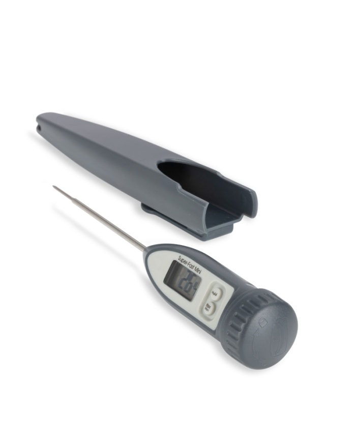 Ficktermometer, T-formad. Denna praktiska ficktermometer mäter temperaturen i intervallet -49,9 till 149,9 °C. Termometern har en Ø3,5 x 120 mm penetreringssond i rostfritt stål. Termometern har en °C/°F-omkopplare och en displayhållningsfunktion. Varje enhet levereras med ett sondskydd som innehåller en fickklämma.