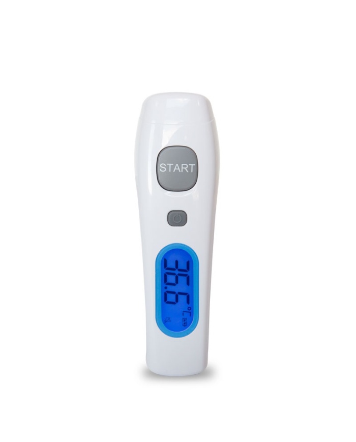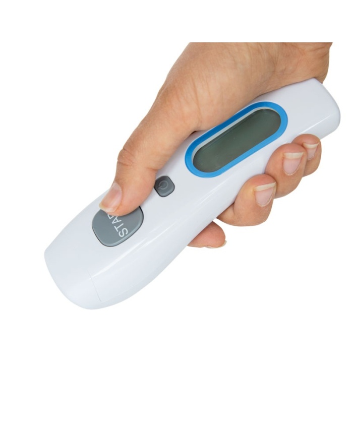 Denna termometer är snabb, exakt och enkel att använda.  Tryck på strömknappen (på/mem) för att slå på instrumentet, håll instrumentet inom 4 cm (40 mm) från mitten av pannan och tryck och håll ned ”Start” -knappen tills du hör ett pip (om det inte är avstängt) som indikerar att avläsningen är klar.  Avläsningar bör ta cirka 1 sekund. Det inbyggda feberlarmet (tre korta pip följt av ett långt pip) hörs när den orala ekvivalenta temperaturen överstiger 37,5 °C.