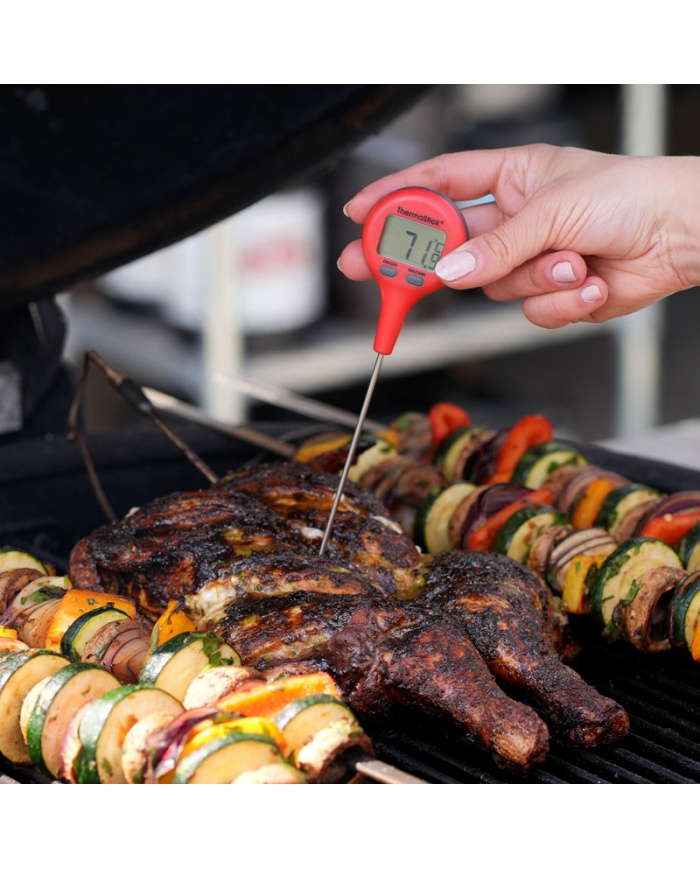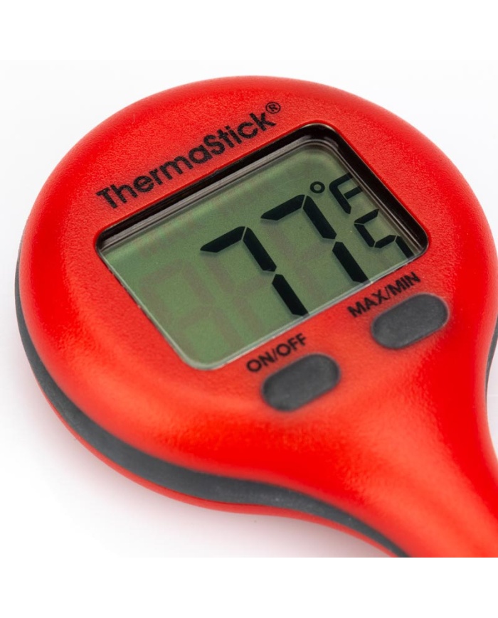 ThermaStick-termometern mäter temperaturen i intervallet -49,9 till 299,9 °C med en upplösning på 0,1 °C/°F och har två lättanvända tryckknappar, på/av och max/min.