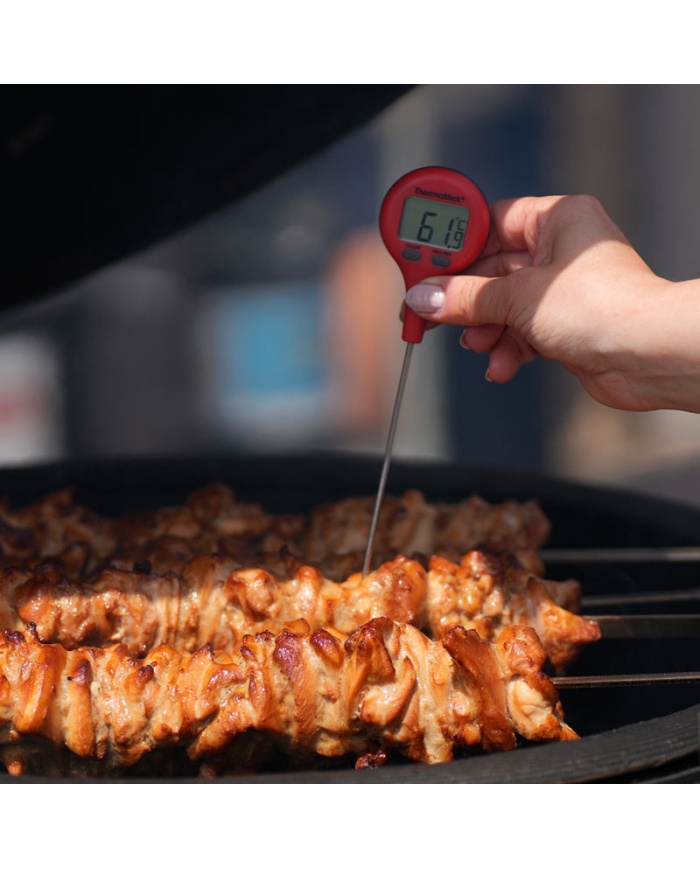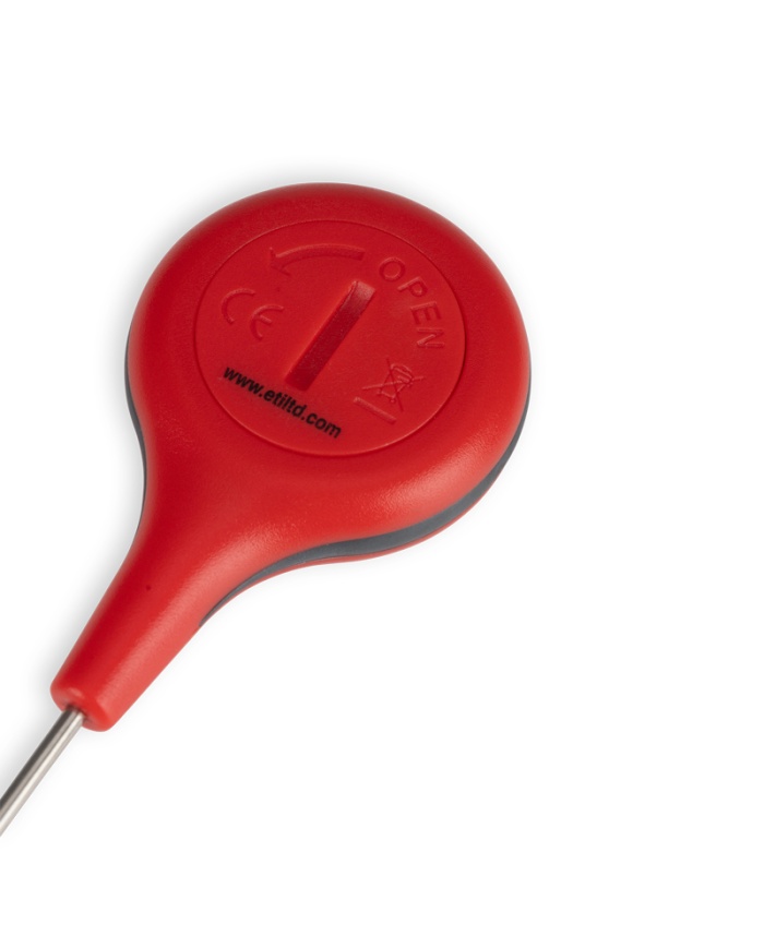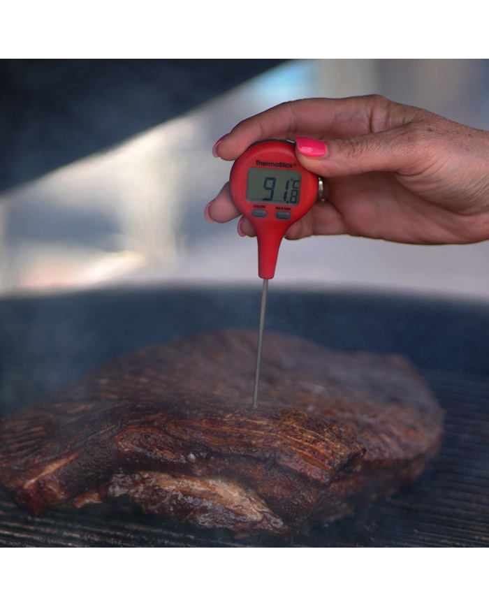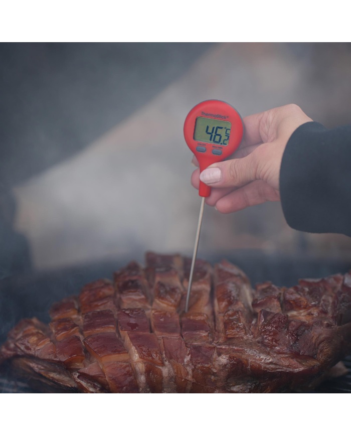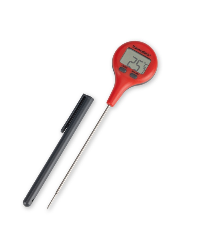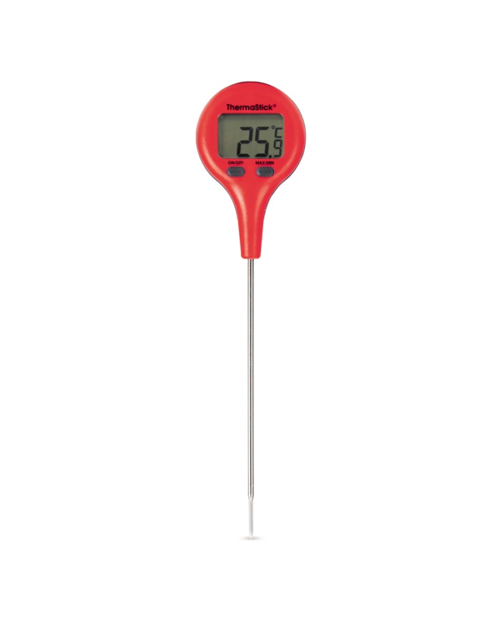 ThermaStick-termometern mäter temperaturen i intervallet -49,9 till 299,9 °C med en upplösning på 0,1 °C/°F och har två lättanvända tryckknappar, på/av och max/min.