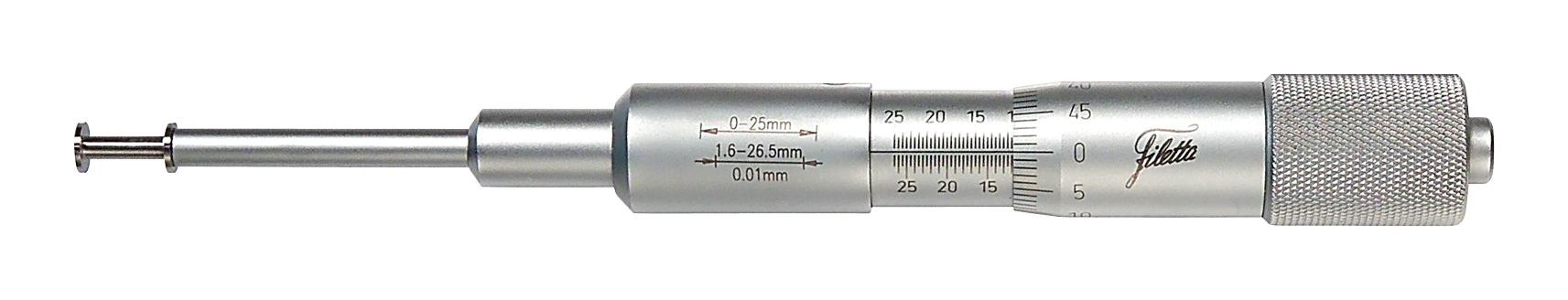 Spårmikrometer, invändigt mätområde 1,6-26,5 mm, utvändigt mätområde 0-25 mm, noggrannhet ±0,01 mm, gradering 0,01 mm, mätytdiameter ø6,5 mm, dubbel gradering